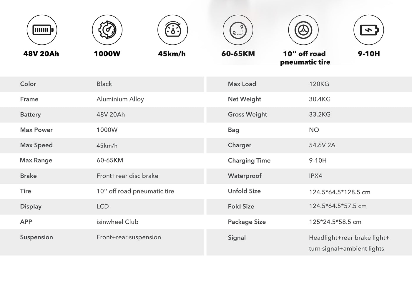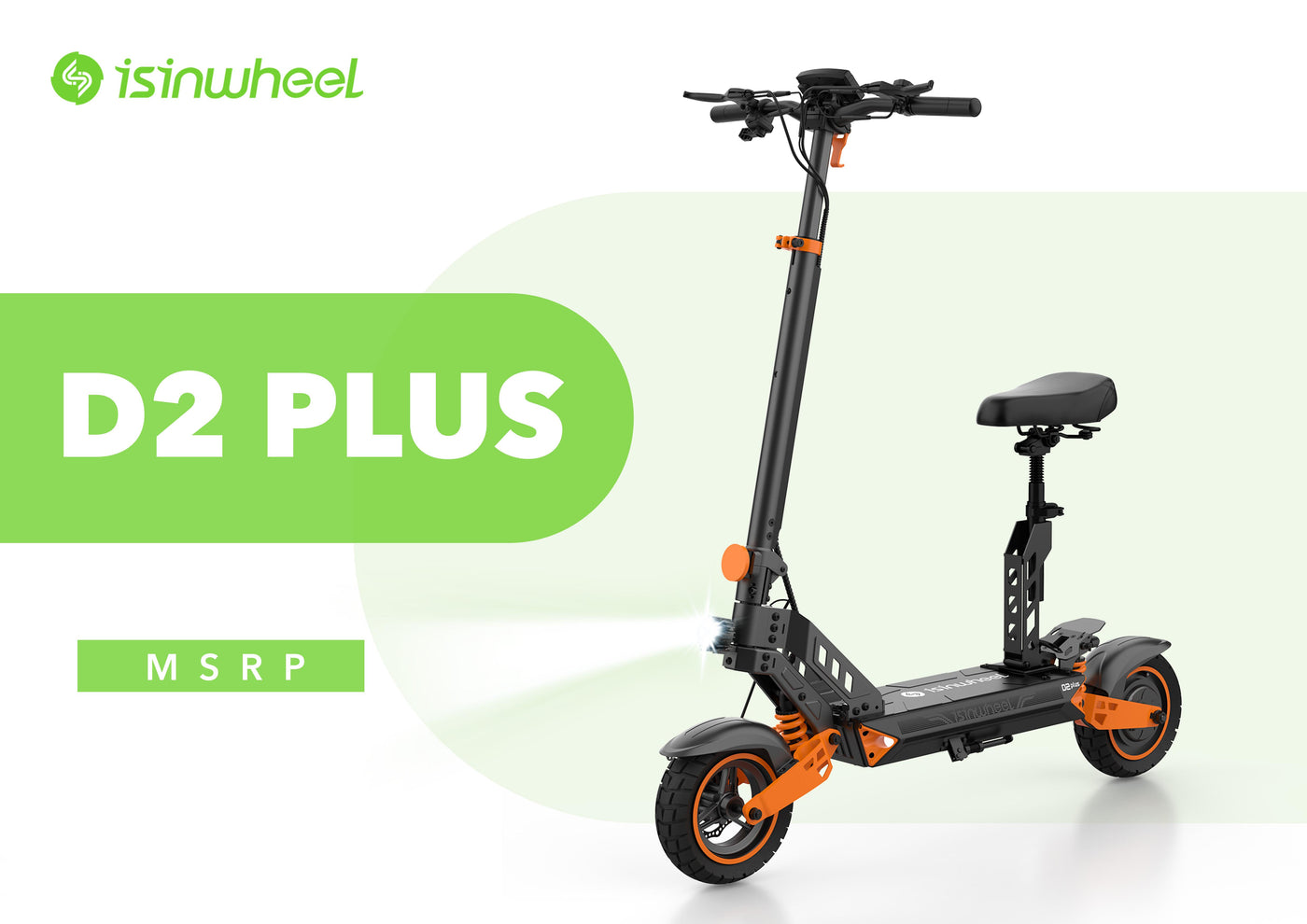 Monopattino elettrico Isinwheel D2 PLUS con batteria da 48V 20Ah, motore 1000 W, velocità massima di 45 km/h, autonomia di 65 chilometri, pneumatici fuoristrada da 10".