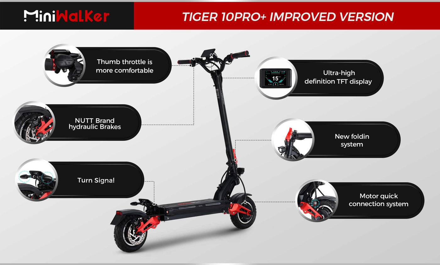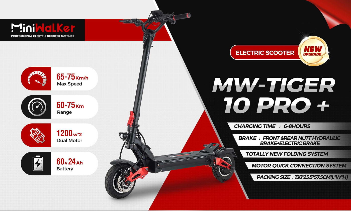 Monopattino elettrico Miniwalker Tiger 10 Pro+ con batteria da 60V 24Ah, doppio motore da 2*1200W, autonomia di 75 chilometri, velocità massima di 75 km/h, Pneumatico da 10*3.0".