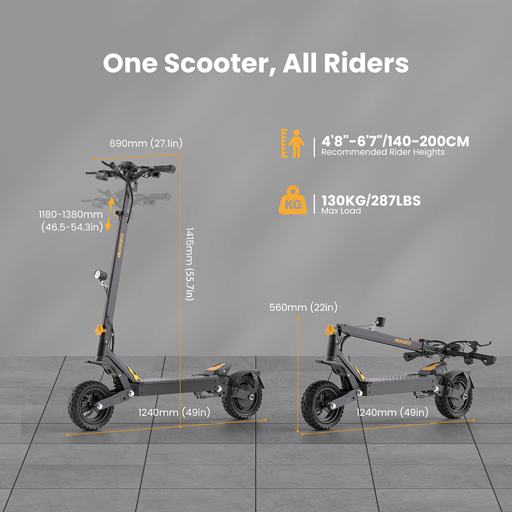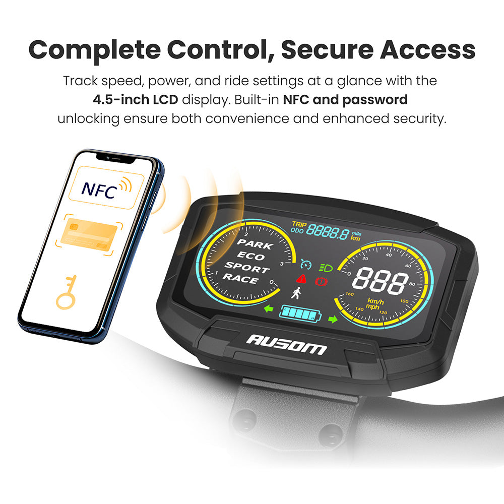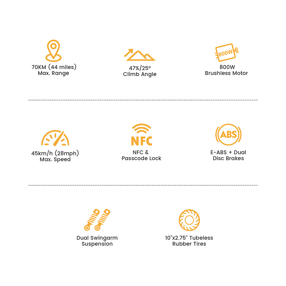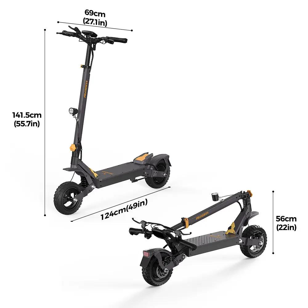 Monopattino elettrico Ausom L1 con batteria da 48 V 15,6 Ah, motore brushless da 800 W, velocità massima 45 km/h, autonomia 70 km, sospensione a doppio forcellone, blocco con codice NFC.