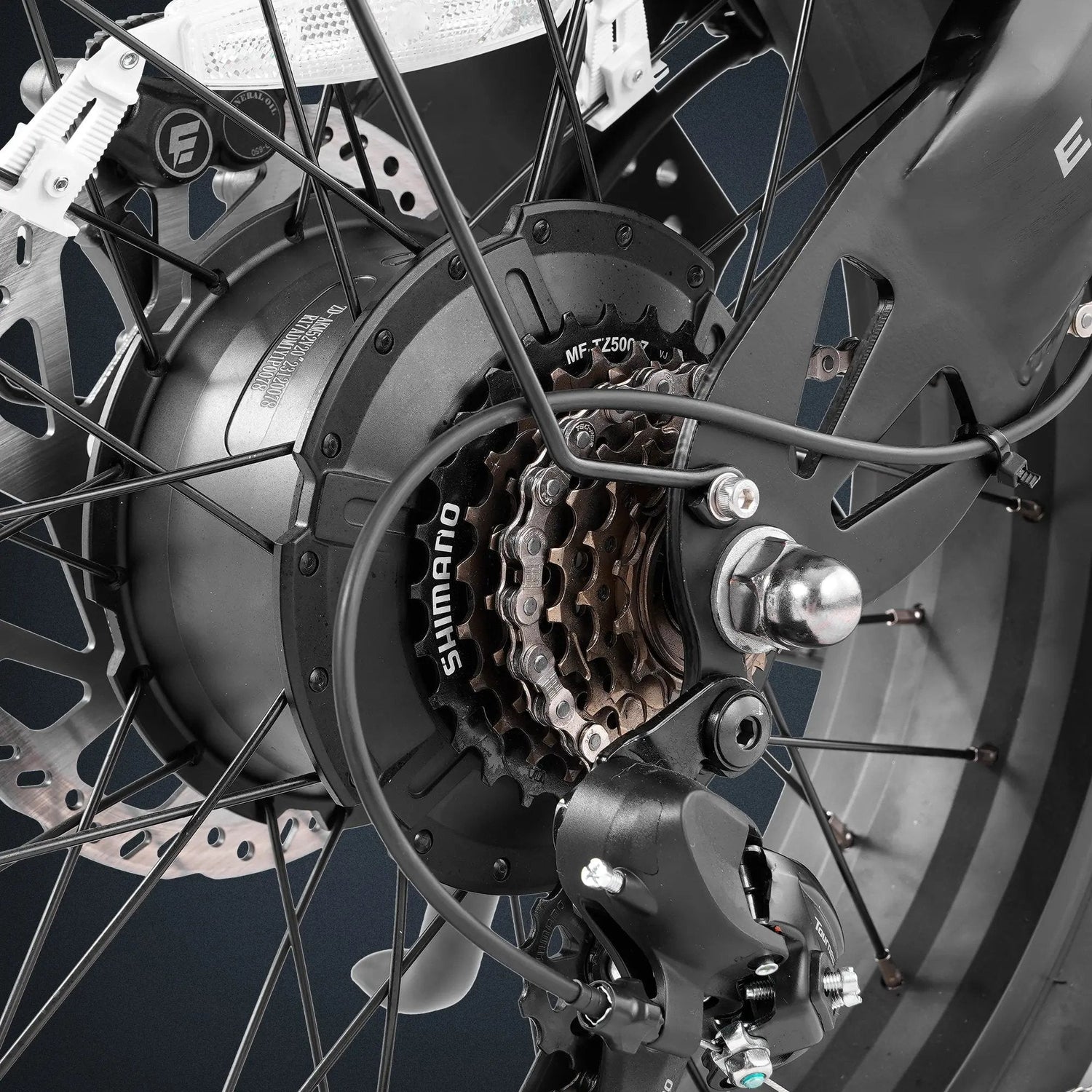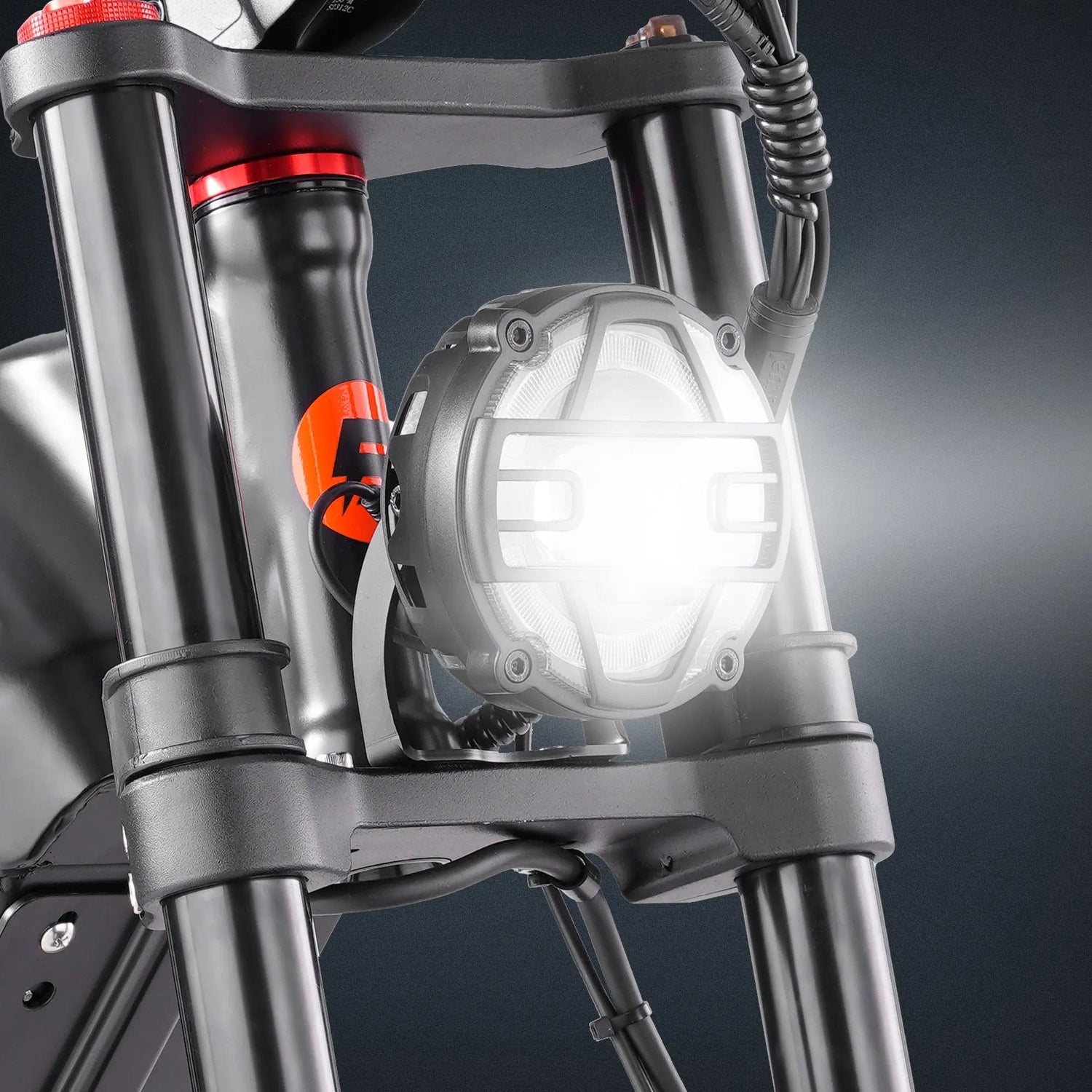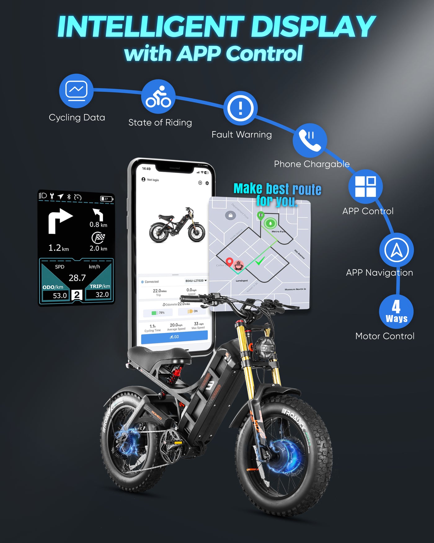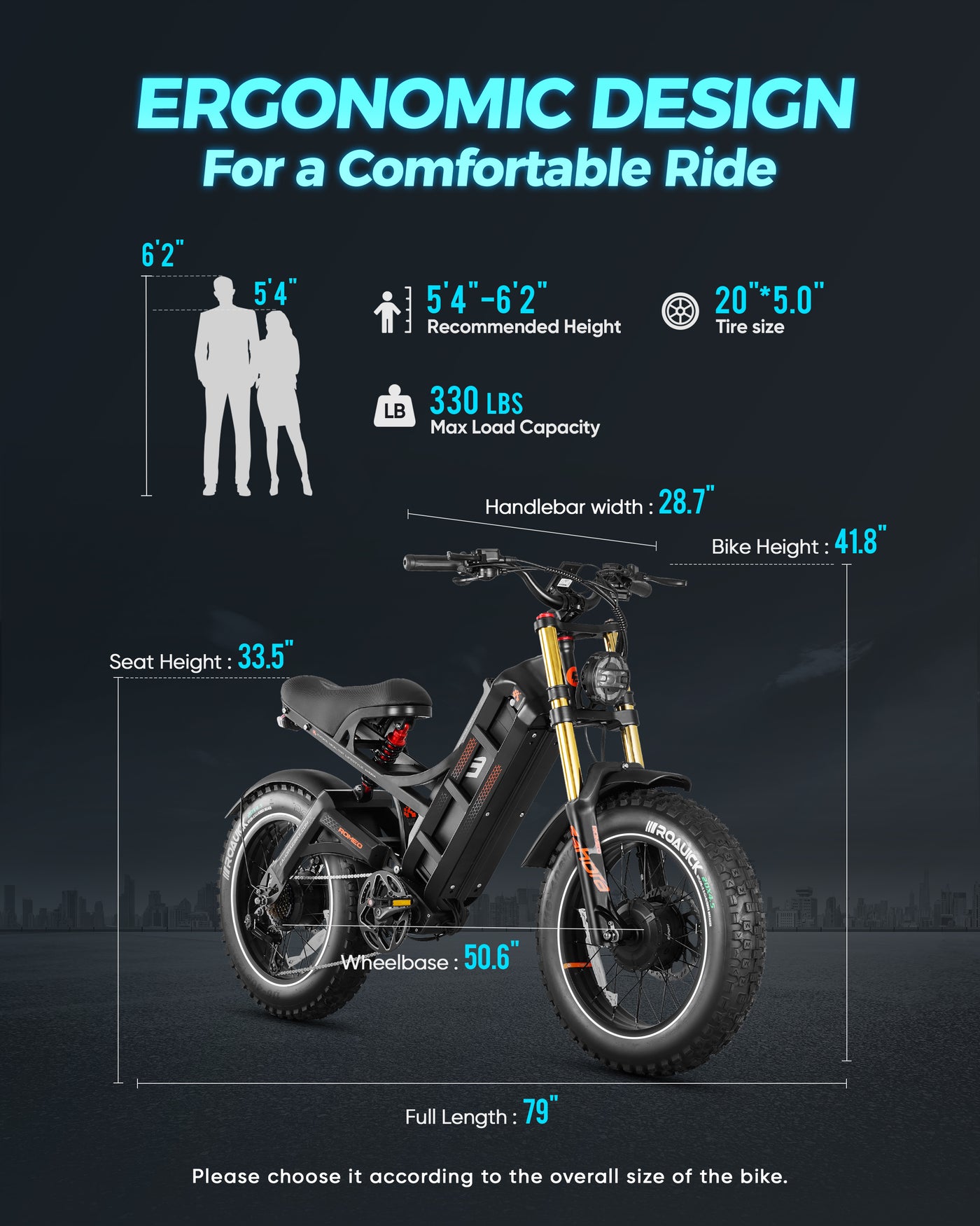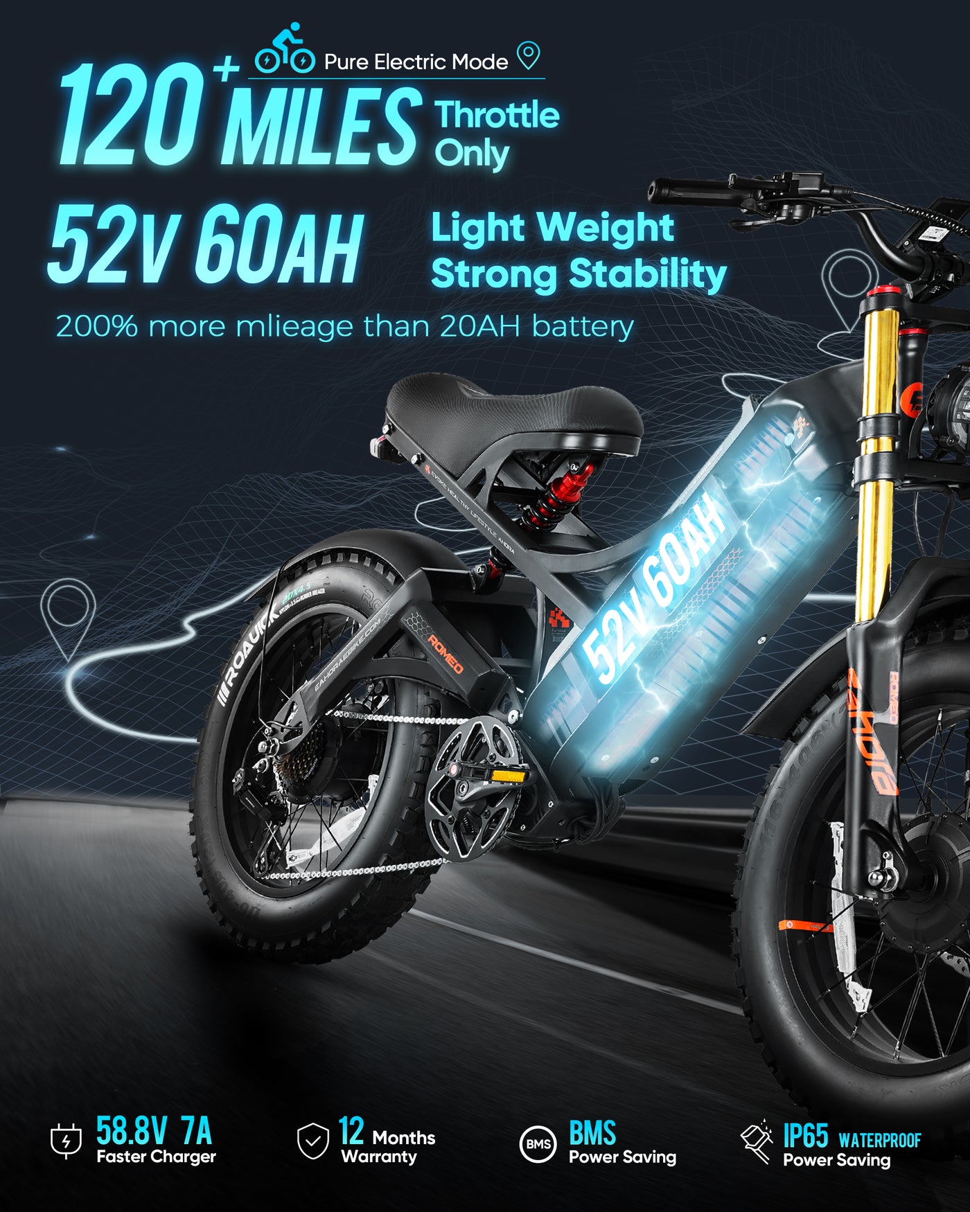 Bici elettrica Eahora Romeo II, batteria 52V 60Ah, Doppi motori 1250W*2, coppia 100 Nm*2, autonomia > 120 km, velocità massima 70 km/h, capacità di carico massima 150 kg, sospensioni: forcella anteriore ad aria e olio, ammortizzatore raro, cerchi 20"*4.5"