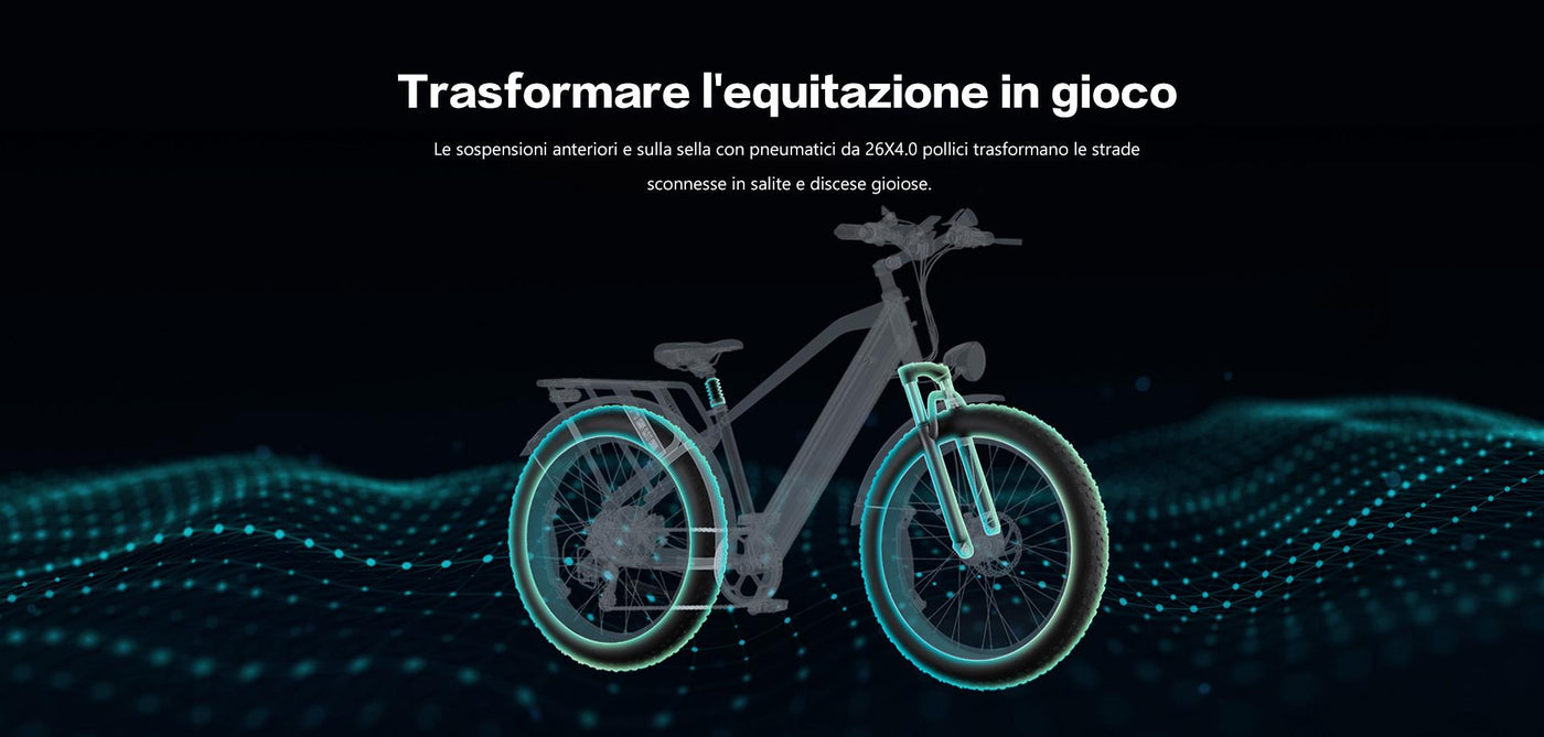 Bicicletta elettrica ENGWE E26 con motore da 250 W, autonomia massima di 140 km, doppia sospensione, bici elettrica adatta a tutti i terreni, cambio Shimano a 7 velocitĆ , velocitĆ massima di 25 km/h, pneumatici Fat da 26*4,0 pollici, carico di 150 kg, freno a disco idraulico.