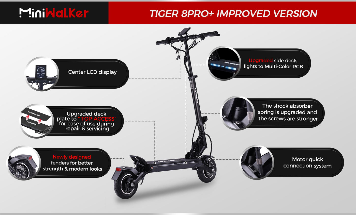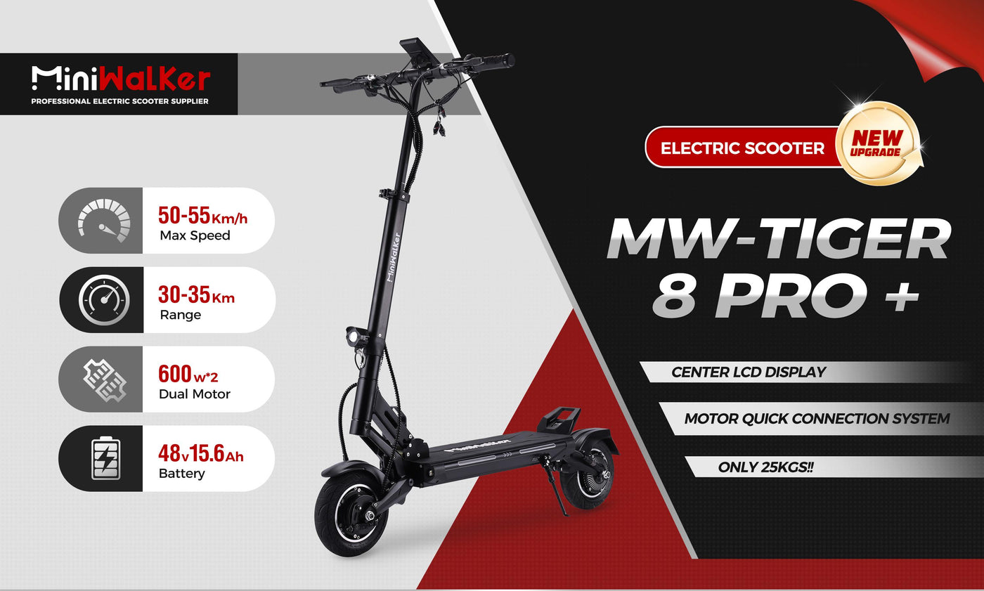Monopattino elettrico Miniwalker Tiger 8 Pro+ con batteria da 48V 15.6Ah, doppio motore da 2*600W, autonomia di 50 chilometri, velocità massima di 50 km/h, Pneumatico da 8.5*3.0".