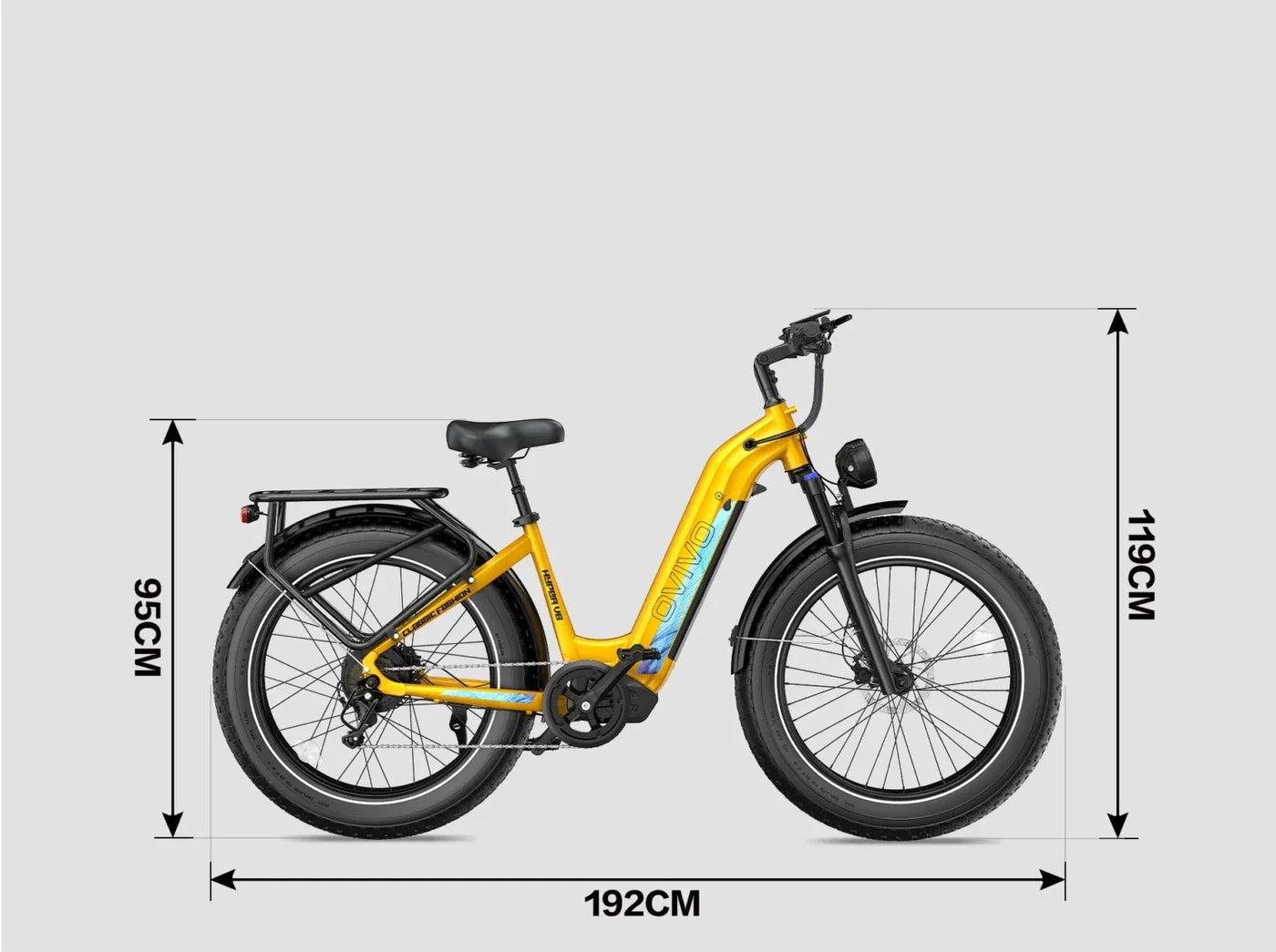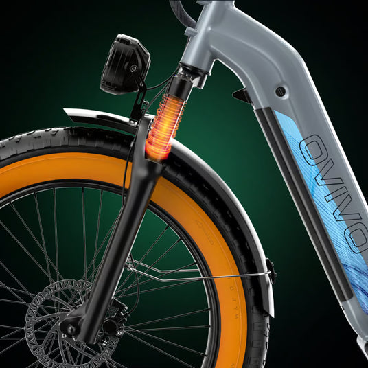 La mountain bike elettrica OVIVO HYPER V6 è dotata di un motore brushless da 250 W e di una batteria agli ioni di litio rimovibile da 48 V e 20 Ah. I suoi pneumatici spessi da 26" x 4,0" offrono prestazioni eccezionali su fuoristrada, terreni montuosi e spiagge. In conformità con le normative UE, la velocità massima della bici è di 25 km/h. In modalità pedalata assistita, una carica completa offre un'autonomia fino a 150 km.