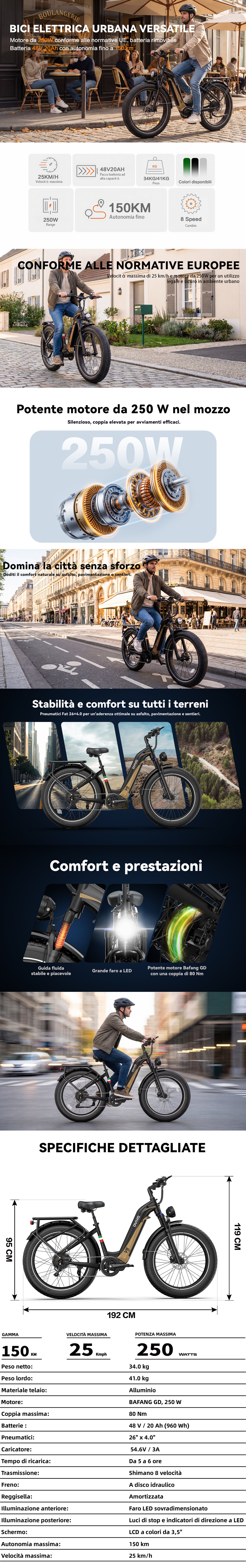 La mountain bike elettrica OVIVO V6 Pro è dotata di un motore brushless da 250 W e di una batteria agli ioni di litio rimovibile da 48 V e 20 Ah. I suoi pneumatici spessi da 26" x 4,0" offrono prestazioni eccezionali su fuoristrada, terreni montuosi e spiagge. In conformità con le normative UE, la velocità massima della bici è di 25 km/h. In modalità pedalata assistita, una carica completa offre un'autonomia fino a 150 km.