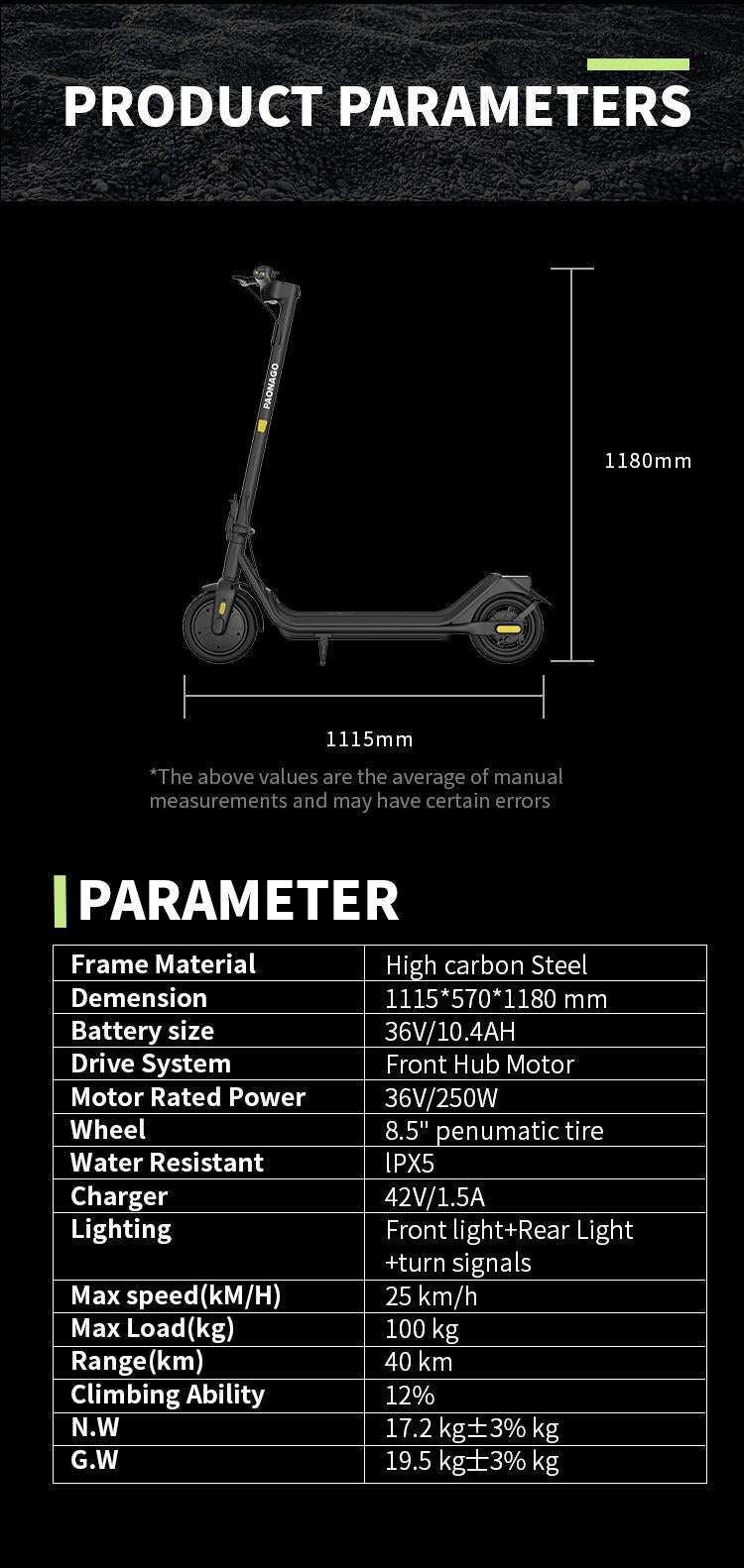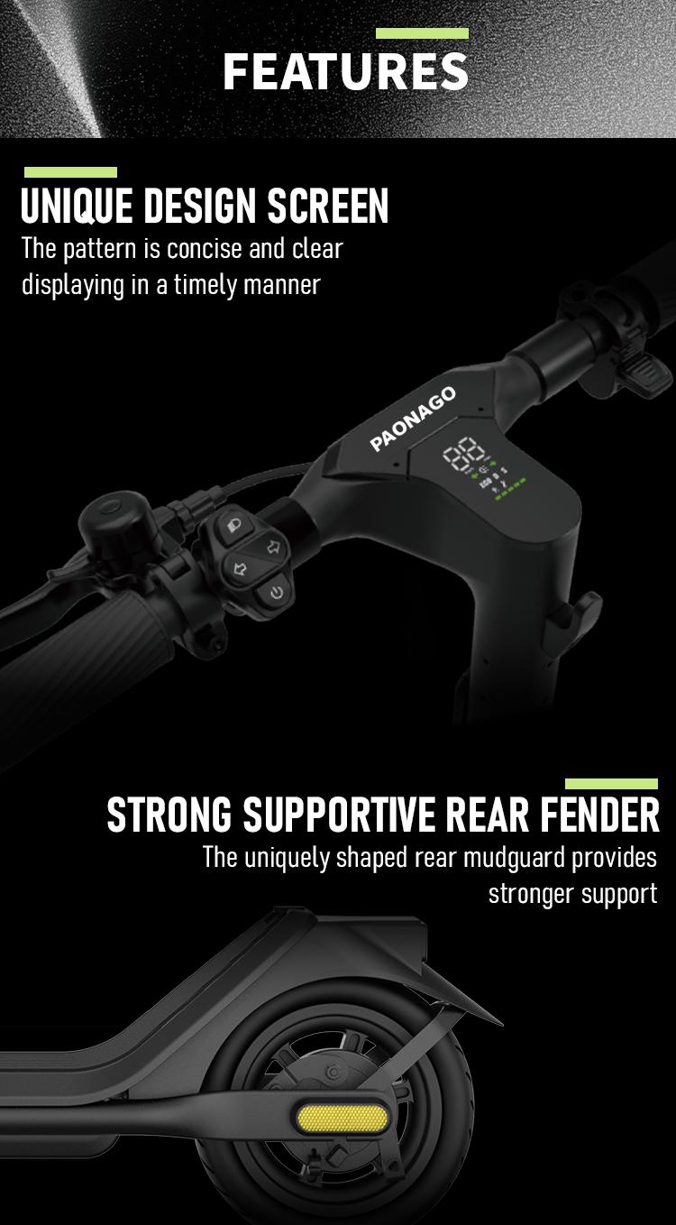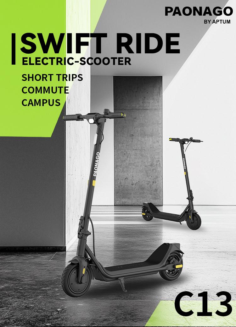 Monopattino elettrico PAONAGO C13 con motore da 250 W, batteria da 36 V 10,4 Ah, velocità massima 25 km/h, autonomia 40 km, telaio in acciaio al carbonio e design compatto e pieghevole per gli spostamenti in città.
