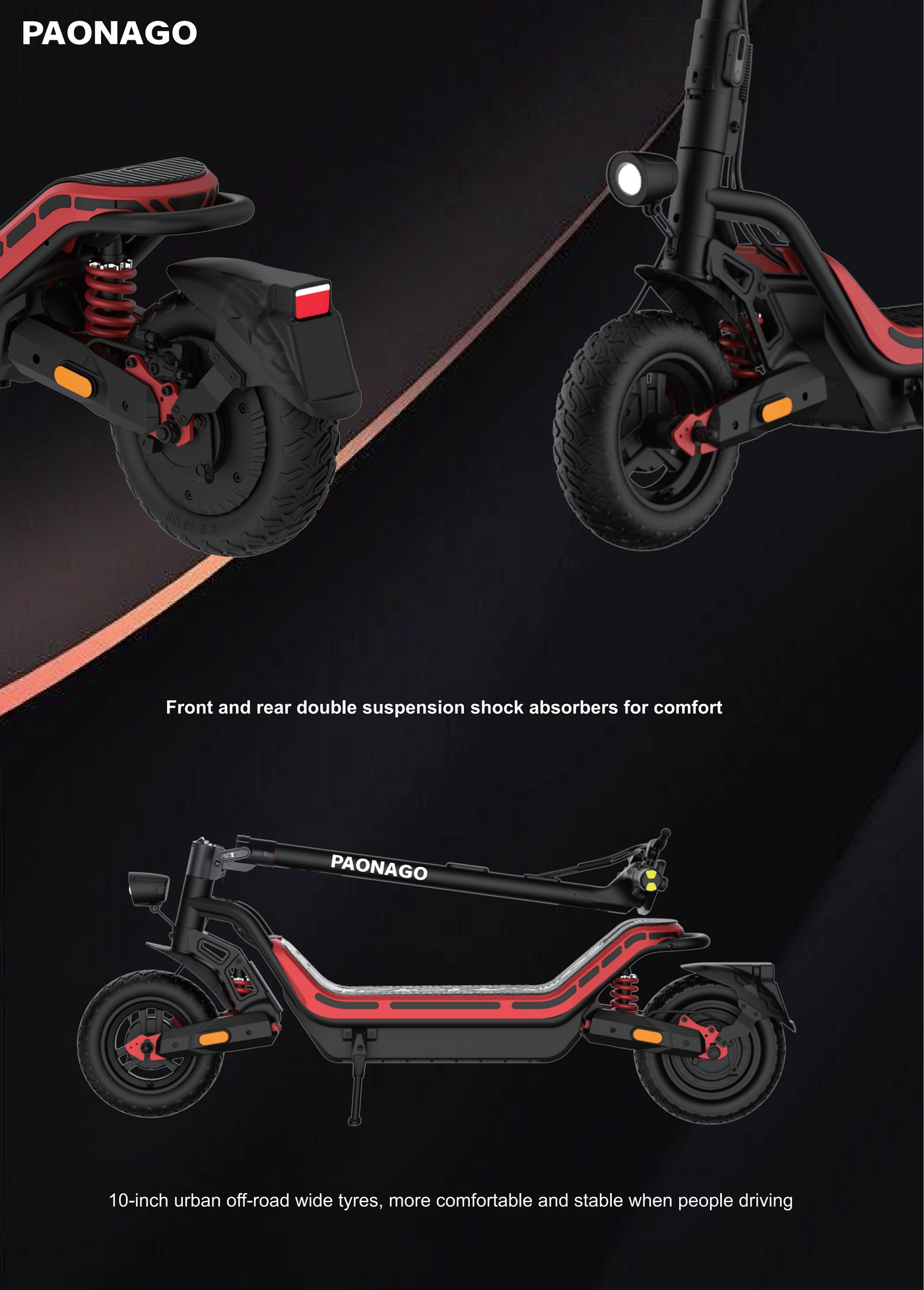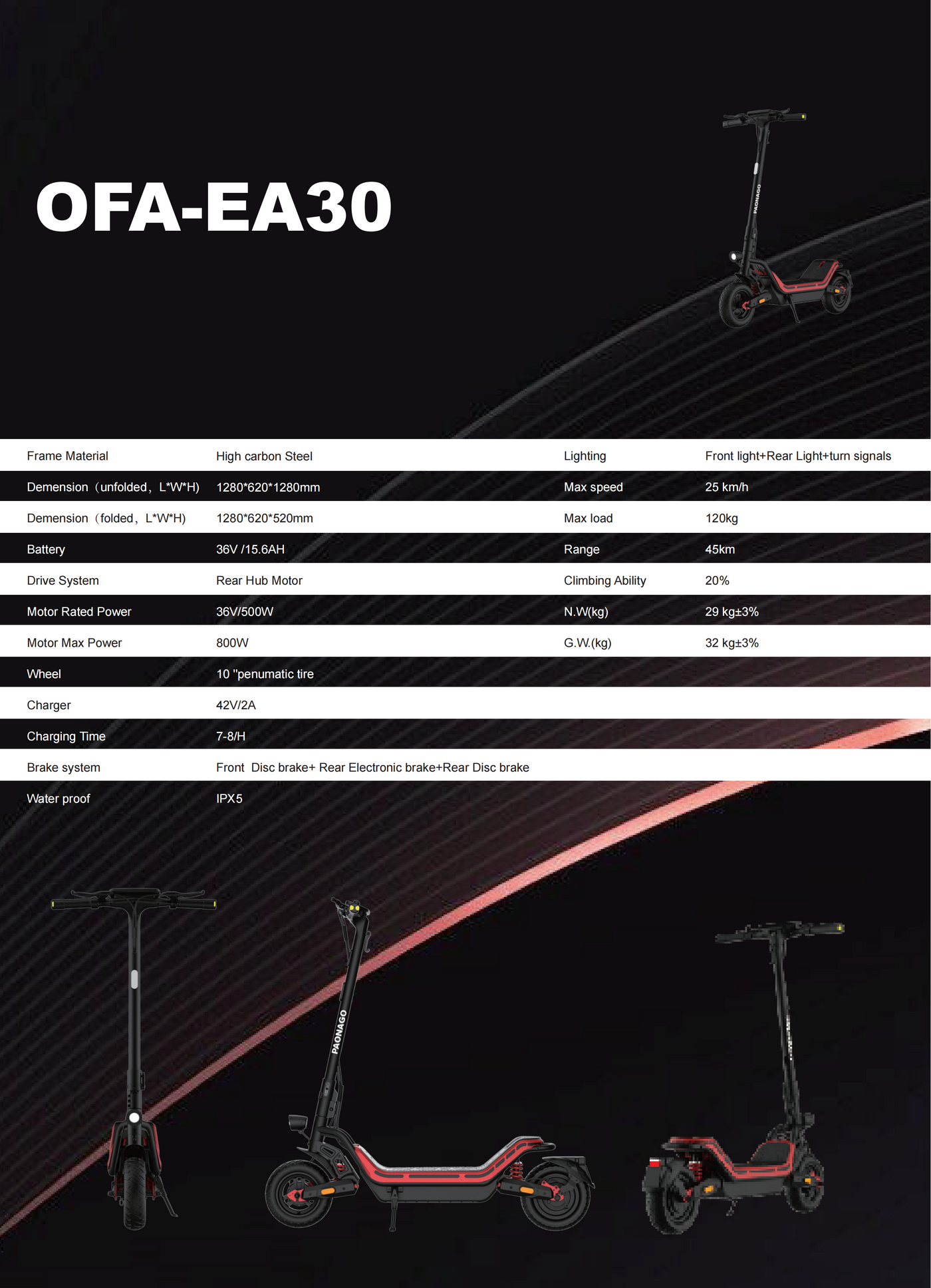 Monopattino elettrico PAONAGO OFA-EA30: motore da 500 W, batteria da 36 V 15,6 Ah, autonomia di 45 km, velocità massima di 25 km/h, capacità di salita del 20% e telaio in acciaio ad alto tenore di carbonio per pedalate potenti.