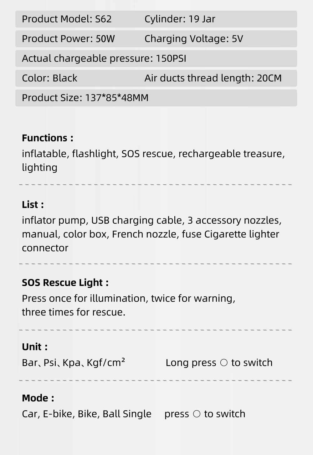 S62 Mini Compressore Portatile Gonfiaggio Rapido Auto Stop