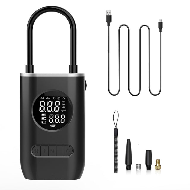 Mini compressore wireless con gonfiaggio rapido, auto spegnimento, rilevamento digitale della pressione e 4 modalità preimpostate. Perfetto per auto, bici elettriche e scooter.